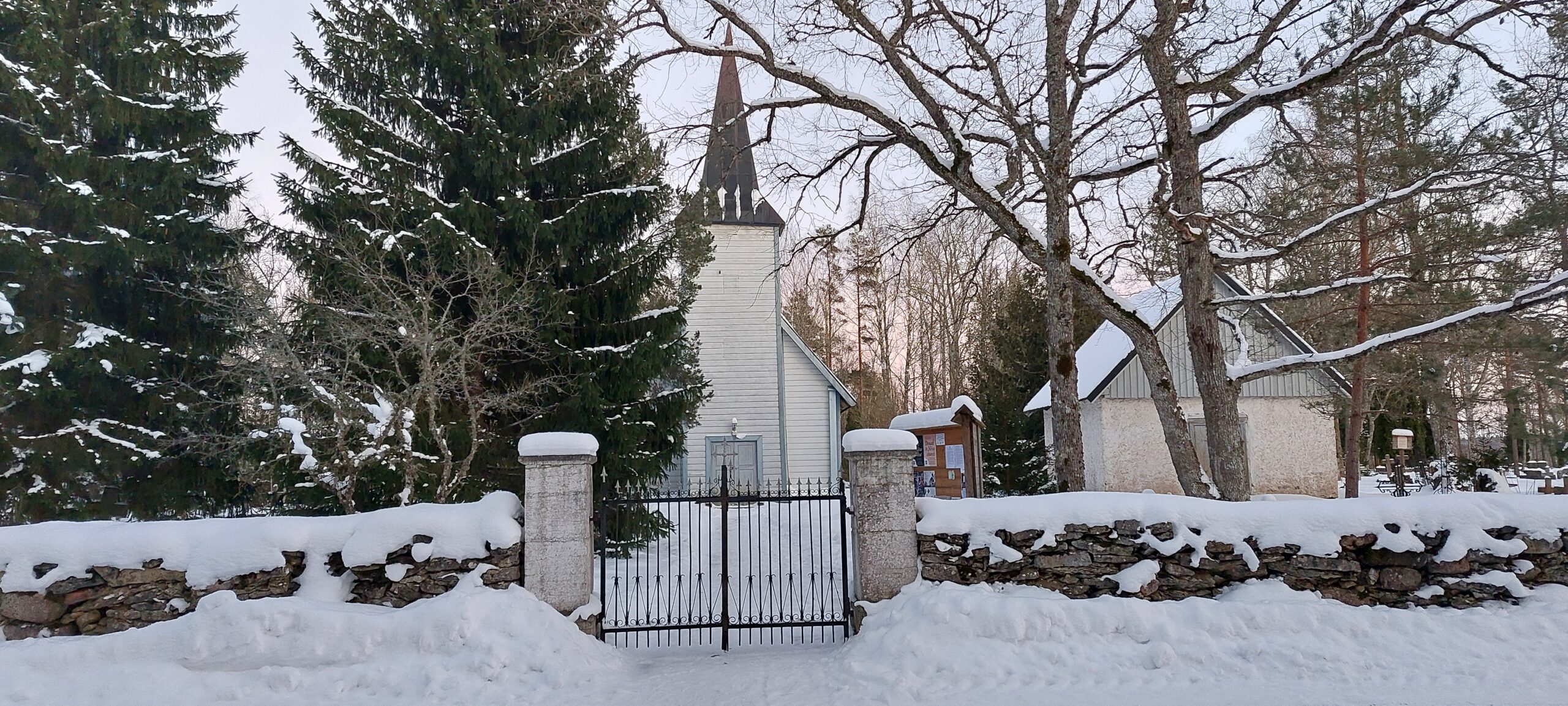 Teenistus toimub talvekirikuks kohandatud kogudusemajas. Maja on soe ja hubane – oled oodatud! Nõva kirik ja kabel 25. jaanuaril 2026. Foto: Nõva kogudus.