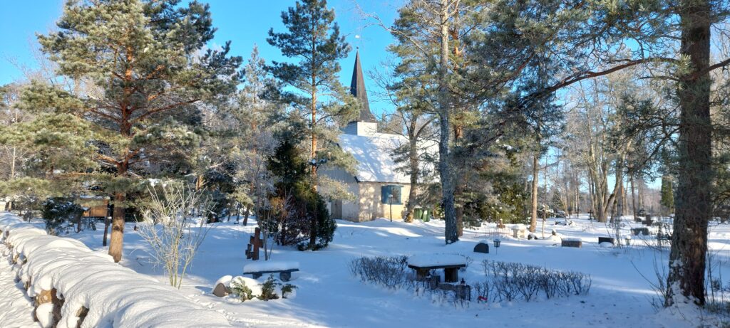 Nõva kirik ja kabel veebruaris 2026. Foto: Nõva kogudus.