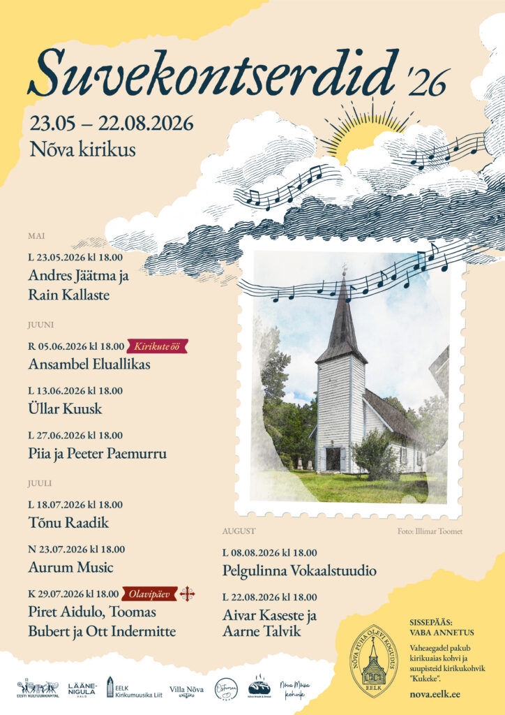 EELK Nõva Püha Olevi kogudus kutsub Sind osa saama üheksast erilisest suvekontserdist armsas Nõva kirikus. Kirikuaias pakub kohvi ja suupisteid kirikukohvik “Kukeke”. Usume, et need õhtud saavad olema meeldejäävad! Tule koos kaaslastega!