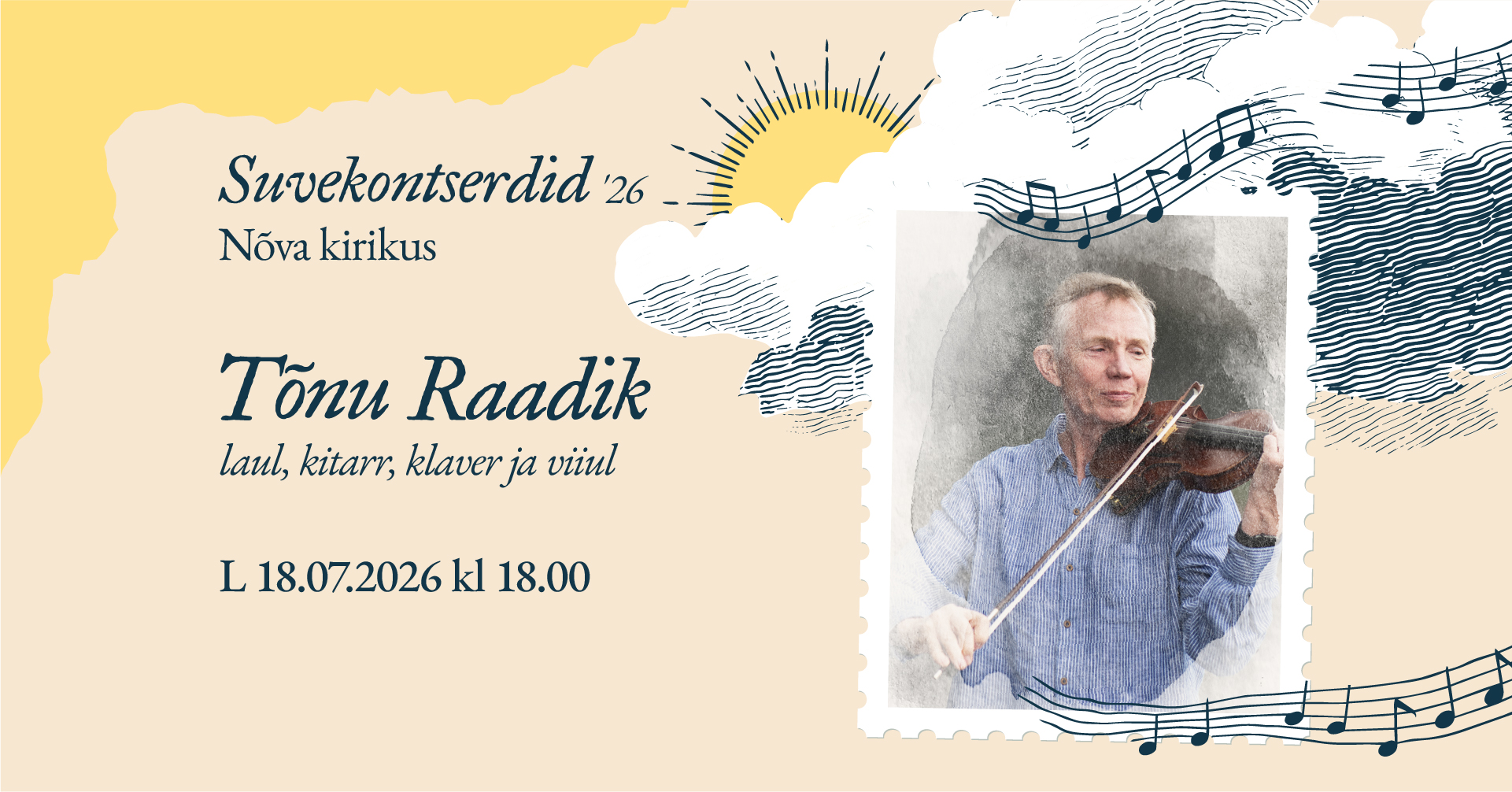 Suvekontsert ’26. Tõnu Raadik Nõva kirikus 18. juulil 2026 kell 18.00. 18. juuli 2026 by Ülle Metsma Leave a Comment Vaata ka kultuurikava.ee