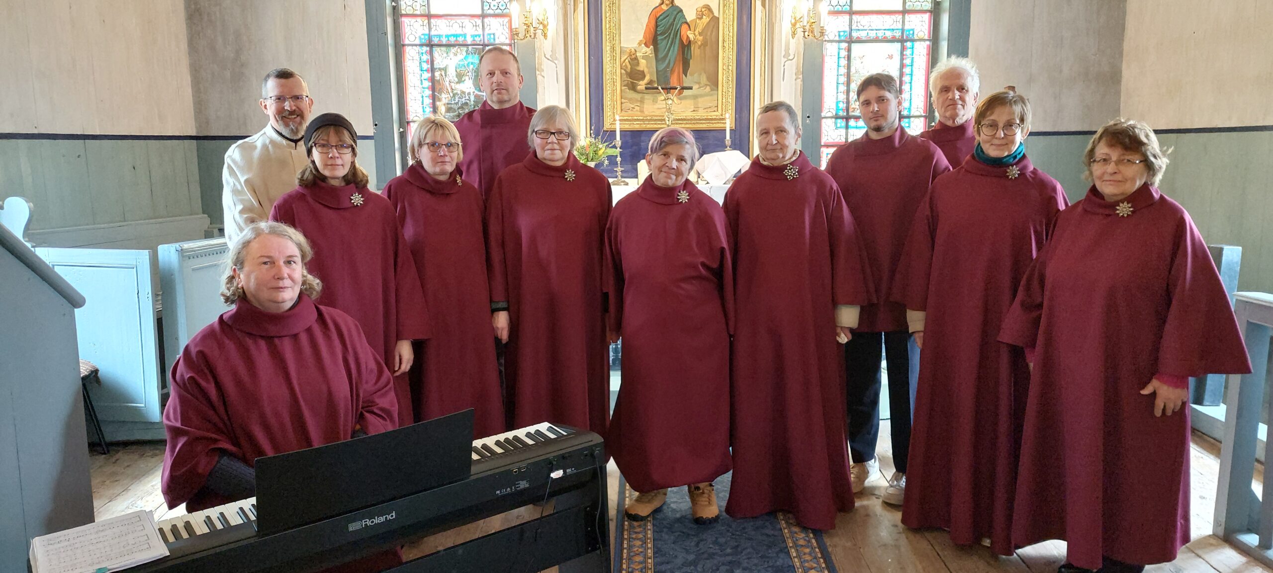 Head koori liikmed! Koorijuht Danguole annab teada, et kõikide häälerühmade kooriproov toimub reedel 26. aprillil kell 12.30. Nõva koguduse koor 1. ülestõusmispüha jumalateenistusel 5. aprillil 2026. Foto: Nõva kogudus. Nõva koguduse koori liige Hans-Joachim Gaiss kinkis Suurel Reedel 3. aprillil 2026 koorile puidust alusele enda kujundatud ja valmistatud plakati. Foto: Nõva kogudus.